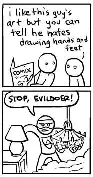 - chainsawsuit: "I like this guy's art, but you can tell he hates drawing hands and feet." The superhero in the comic has his hands obscured by a lamp, a chandelier, a pelican, newspaper, and a roof. And even the pelican's feet are obscured.