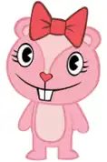 A friendly pink chipmunk who wears a red hair bow. Giggles is one of the four "original" Tree Friends and is most often played as a girly girl, along with Petunia (with whom she is best friends). She also cares strongly for the environment, and will lose her cute nature when she sees someone littering or polluting. Despite being the one most often paired with other Tree Friends for Valentine's Day episodes, she and Cuddles are seen as the "default pairing" of the series.