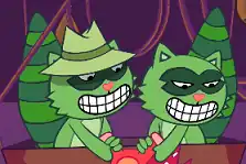 Two kleptomaniac green raccoon twin brothers, the older of which (Shifty) is always wearing a green fedora. Lifty and Shifty often scam or steal from unsuspecting Tree Friends (mostly Lumpy) in an effort to get rich. They are played as sinister characters with narrow eyes, dark mask-like markings around their eyes, wide grins, and trademark evil snickers. Often times they work together to steal or scam, though they will sometimes fight, kill one another, or abandon the other to die in favor of riches or goods.
