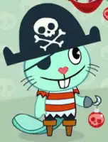 A turquoise pirate sea otter with a Jolly Roger hat, eye-patch, ripped striped shirt, black pants, two peg legs, and a hook hand. Russell dresses and talks like a pirate, with his vocabulary consisting almost entirely of "Yar!" He enjoys the sea and nautical activities, such as fishing, sailing, or hunting for treasure, and he even lives in a house boat (perched in a tree). His early design had him with five-o-clock shadow, but this has been retired since his second appearance onward.