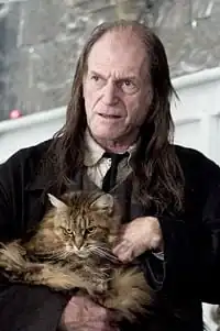 The Hogwarts caretaker, he has an extremely antagonistic relationship with the students and mostly acts as an obstacle to Harry throughout the series. His bitterness torwards the students probably stems from the fact that he is a Squib, that is, someone who while born into a magical family has no magical abilities on his own. He has a cat named Mrs. Norris, probably the closest thing he has to a friend.