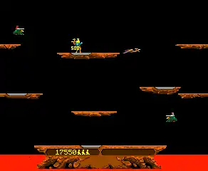 During the first two waves, flooring at the bottom of the screen covers a lava pit, which is uncovered on the third wave as the floor burns away. On the fourth and subsequent waves, a troll inhabits the lava pit; if any player or enemy knight flies too close to the lava, the troll's hand will emerge and tug the mount down toward the lava. Players can escape the troll's grip by repeatedly pressing the "Flap" button.