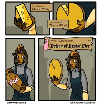 Similarly, chemists and potion makers can create any liquid or potion by mixing two liquids in kept test tubes. There may be a chance (depending on the game) of getting a small explosion instead, which can have any effect from simply coating the face with a harmless dark, dusty substance, to changing the potion maker into an animal.