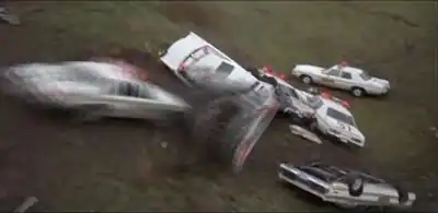 - Taxi 2. Dozens of police cars follow the main characters. Wherever the main characters' car goes, the police go as well—all of them. The damage caused by the followed car is nothing compared to the destruction caused by the cops. Eventually one cop wrecks and all of the others plow into him and into the resulting wreckage. Not one police car survives. Accompanied by a great sound track, as well.
