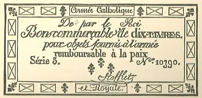 He inhabited the old hut at the end of the garden, in company with Fauchelevent. This hovel, built of old rubbish, which was still in existence in 1845, was composed, as the reader already knows, of three chambers, all of which were utterly bare and had nothing beyond the walls. The principal one had been given up, by force, for Jean Valjean had opposed it in vain, to M. Madeleine, by Father Fauchelevent. The walls of this chamber had for ornament, in addition to the two nails whereon to hang the knee-cap and the basket, a Royalist bank-note of ’93, applied to the wall over the chimney-piece, and of which the following is an exact facsimile:—