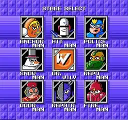 - Incredibly Lame Pun: ALL of the robot masters' names (Anchor Man, Hit Man, Police Man, Snow Man, Repo Man, Door Man, Repair Man and Fire Man). They're based off real occupations or objects.