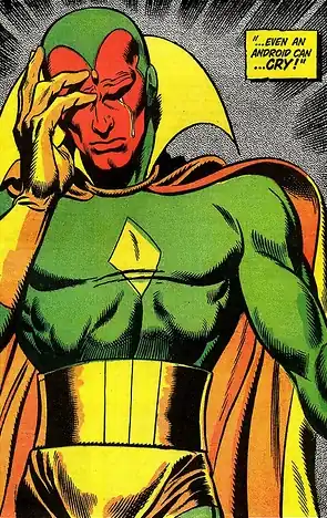 - Pictured is The Vision, the android member of The Avengers. In his first appearance, he turned on his creator (the evil robot Ultron) to save the Avengers, and they welcomed him into their ranks. Thus he found out that "Even an android can cry!"