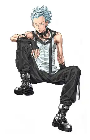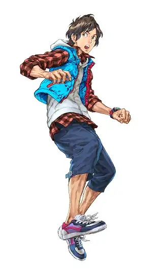 A foul tempered young man with white hair. His attitude can make him difficult to deal with, but he's determined to push forward and doesn't like indecisiveness. His bracelet number is 3. His name is derived from "san", the Japanese word for three, and was unchanged for the English-language version.