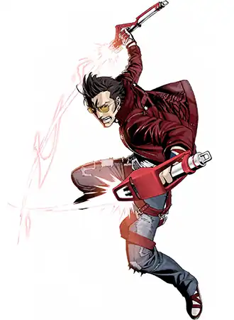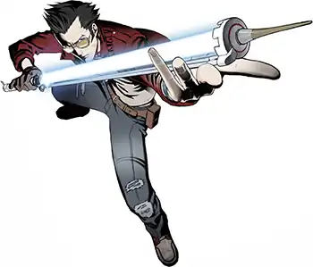 - Guns Akimbo / Dual-Wielding: Has two guns that, in addition to shooting bullets, shoot missiles and have retractable swords inside them.