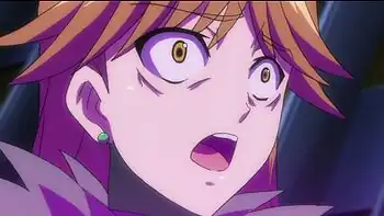- A Certain Magical Index II has Awaki flashing this face when she realizes that ACCELERATOR is personally after her. Cue absolutely epic Curb Stomp Battle.