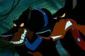 - Expy: Somewhat like the alligators, Brutus and Nero, from The Rescuers, since there are two of them, and both serve the villain.