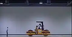 - Parodied in Austin Powers: International Man of Mystery. As the protagonists escape on a very slow Road Roller, a lone security guard screams in terror as the roller approaches and proceeds to scream "STOOOOOP!!" multiple times as it approaches, making no attempt to move to the left or right until finally being run over.