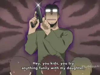 - Pictured above: In Fullmetal Alchemist, Maes Hughes holds three-year-old boys at gunpoint as they attempt to play with his daughter Elysia on her birthday. Complete with Scary Shiny Glasses.