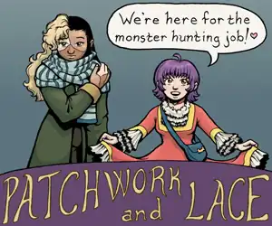 Patchwork and Lace is a fantasy web comic following the adventures of two monster hunters: Sheol, a quiet and stoic Flesh Golem; and Lilika, a flighty and upbeat magician. It's created by the people behind Reliquary and Hazard's Wake.