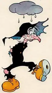"The concept of a "personal raincloud" that follows someone around probably dates from the "world's worst jinx" character Joe Btfspl in the Al Capp comic strip Lil Abner. Personal dust clouds or rainclouds have appeared with numerous other characters since then, including Pig-Pen in the Peanuts comic strip and the animated Schleprock in The Pebbles and Bamm Bamm Show (also a terrible jinx). Rain and rainclouds follow the character Rob McKenna in So Long, and Thanks for All the Fish by Douglas Adams wherever he goes. A localized rain-and-thundercloud also floats above the rolling home of The Addams Family in their original Hanna-Barbera animated series." |