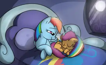 - Rainbow Dash and Scootaloo comforting each other after a shared nightmare (actually a vision of the Epilogue timeline).