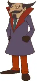 - Jerkass: Shoves Layton out of the way of an alternate door the latter decides to take to answer Puzzle 004 and falls down a trapdoor for his trouble.