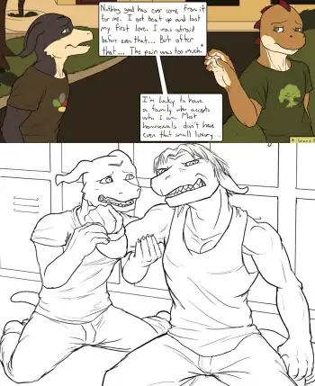 Gian's First was written by Roommates writer Dreamous. The story contains mature sexual situations and dialogue, and is Not Safe for Work. It is located here, and viewing requires a registered Fur Affinity account with mature content activation.