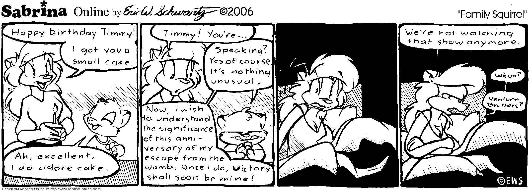 - There's one early strip where Amy has a nightmare that Timmy is an evil genius. She wakes up Tom and informs him that they are never watching Family Guy again. (The show isn't mentioned by name, and Tom wonders if Amy means The Venture Brothers.)