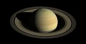 Saturn's orbit isn't perfectly circular; at perihelion, it's barely 9 A.U.[1] from the sun, but then it swings out until it's over 10 A.U. away from the sun at aphelion. One complete orbit takes a hair under 29-and-a-half years.
