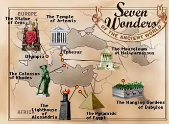 - ↑ The earliest lists had the gates. The later, more well known one replaced them with the lighthouse.