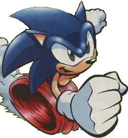 Billed as "the Hero of Mobius," this version of Sonic is still brash, irreverent, and cocksure, but also has heroing as a full-time job that he couldn't quit if he wanted to (not that he does). Robotnik's coup against the government happened when Sonic was five years old, and for the ~10 years of Comic Book Time since he's spent the majority of his energy enthusiastically opposing him. Though not the tactical leader of the Freedom Fighters, he is certainly their most iconic member, and one of their greatest assets against Robotnik. Sonic's ego, though undeniable, is braced somewhat by a spirit of teamwork and a genuinely selfless impulse, against a backdrop of sobering losses to a tyrant who has wreaked havoc amongst the lives of Sonic and his friends and family. Thus at his worst Sonic is occasionally thoughtless or insensitive, but generally friendly and easygoing, quick to forgive and loyal to a fault. As of issue 236, Sonic is now the leader of "Team Fighters", seeking to hunt down the Death Egg II.