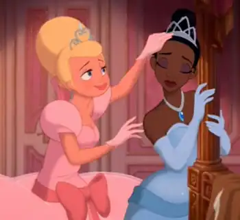 - Pictured above: When first introduced, Charlotte "Lottie" LaBouff of The Princess and the Frog is shown to have her dad's wealth and influence as the un-crowned king of New Orleans completely under her thumb, and she gets anything she wants. She is a ditz with an obsession with becoming a Princess, but she is a remarkably sweet ditz and is Tiana's best friend. Early in the film she is throwing a lavish masquerade ball to snare the visiting Prince Naveen and hires Tiana to cook her delicious signature treats to help, since "the way to a man's heart is through his stomach." However, when Tiana ended up crashing into the table of treats and knocks them to the ground, Charlotte, rather than get annoyed at Tiana or demand that she bake a new batch, instantly realised it was a total accident, took her upstairs and got her cleaned up by lending her some of her (Charlotte's) own clothing. Before that, she was helping Tiana buy her resturaunt by hiring her for the party without haggling the prices of the food. Charlotte's dream is to marry a prince, but she wants Tiana to have her dream, too, so she kisses Naveen the Frog Prince to turn him and Tia human, even if he will not marry her. Her kiss ultimately fails to turn him human again, but she didn't know that at first.