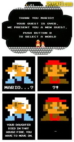 "Imagine that Nintendo made a game where Mario defeats Bowser, and he finds Princess Peach, poisoned, lying on a bed, telling Mario with her last breath that she loves him...and then the game ends. This is sort of devious plot that child psychologists must concoct in order to increase their clientele."