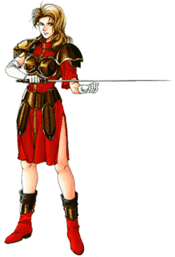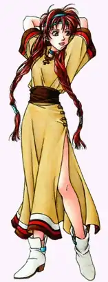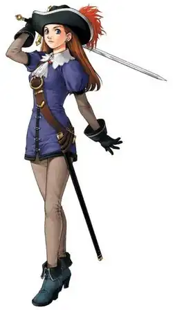 The spoiled daughter of Gustav Pendragon, the head of the Tinto Republic. As a child, she is kidnapped by the vampire Neclord, forcing a rescue attempt by Riou, Viktor, Koyu, Marlow, Sierra Mikain and Kahn Marley. Fifteen years later, she has grown into a capable swordswoman in search of the Fire Bringer in the Grasslands, although she's now a very snobbish individual. Despite this, however, she means well, and becomes one of the new Fire Bringer's top generals under her friends Chris and Hugo.