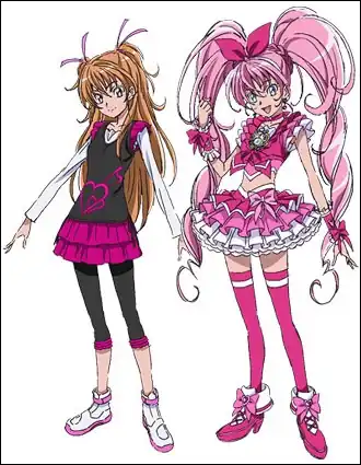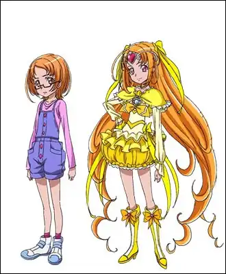 - Hair Decorations: Prior to her Heel Face Turn, her human form was distinguished by a clef-shaped hair pin. Since becoming Cure Beat, she's apparently replaced it with a yellow scrunchy.