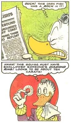 - In one Don Rosa story, a contest involved catching entries tied to balloons and when a balloon flies above Gladstone, he refuses to exert himself reaching for it, reasoning that if it was the winning entry, the balloon would pop and drop the entry into his hand, which actually happened. He lost the raffle because Donald's nephew persuaded him to switch the tickets (Donald had gotten the rest of them), but his consolation prize (a year's supply of oolated squiggs) included a fish that swallowed a 10 carat diamond and the main prize was a cruise ship that went icebound