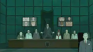 - The Season 3 premiere of The Venture Brothers features the Guild of Calamitous Intent's Council of Thirteen as they interrogate the Monarch and Dr. Girlfriend, in the process parodying this trope about as far as it can go. Over the course of the episode, they trip over each other's sentences, argue about what to call themselves, make gestures that can't be seen by their subjects, and complain about their lack of Surveillance as the Plot Demands.