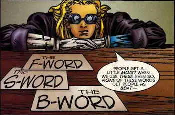 - In Going Postal, after Moist von Lipwig goes on a screaming tirade about Reacher Gilt's smug, weasely speech in the Ankh-Morpork Times, the ultra-prim Miss Maccalariat admonishes him to avoid using the K-word, the L-word, the T-word, the V-word, the Y-word, and both of the S-words in the future. "Murdering conniving bastard of a weasel" was acceptable, however, since he was talking about Reacher Gilt.