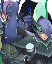 Two robotic brothers that serve Creed's faction. They are classed as "Ace-Type" mechanoids, the strongest fighting type. They can also resonate their artificial Spiria in order to boost their abilities, in a manner similar to the party. Chlorseraph is the one at the front with the twin blades; Clinoseraph is the one at the back with the stronger armour.