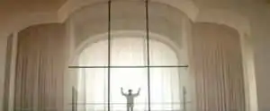 - Quite possibly a reference: In the filming of the wedding scene for The Graduate, the church they filmed the scene in was, in fact, concerned that in banging on the window Dustin Hoffman would do just that, which is why he extends his arms the way he does (he reasoned that just flapping his hands at the end of his wrists like that wouldn't put enough pressure to break) and gives everyone the impression that the director wanted him to be a messianic figure there.