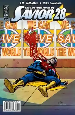 is a miniseries published by IDW, written by J.M. DeMatteis and drawn by Michael Cavallaro. Savior 28, a Captain Ersatz of Superman and Captain America, has been called the Avatar of Liberty for 60 years. His real name is Jimmy Smith and he is 102 years old, even though he still looks to be 35. However, Savior 28 has finally decided to stop fighting for justice with violence and become a pacifist. Of course, being an Actual Pacifist and a Technical Pacifist are two different things. Also, there are supervillains eager for his blood, superheroes who wonder whether he's an evil impostor, and his former sidekick, who narrates the whole tragic tale. Dennis McNulty, formerly the Daring Disciple, assassinates Savior 28 midway through the first issue.