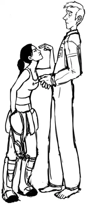 - Huge Guy, Tiny Girl: Though their exact heights are not determined, Chell is described as barely coming up to the level of Wheatley's chest.