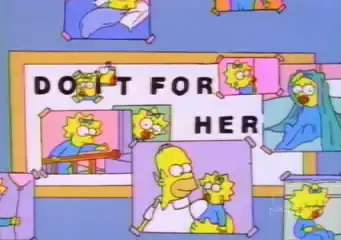 - The end of The Simpsons episode "And Maggie Makes Three". A Whole-Episode Flashback is triggered by Homer being asked why there aren't any pictures of Maggie in the photo album. Homer explains how Maggie's birth forced him to quit his dream job working at Barney's Bowl-a-rama and return to his job at the Nuclear Plant, which he had quit months earlier (and hates). To add insult to injury, Mr. Burns installed a plaque in Homer's workstation reading "Don't forget: You're here forever". Bart asks what the point of Homer's story was, and it's revealed where the photos of Maggie are: Homer has posted them all over his workstation, strategically covering up the plaque so that it reads "Do it for her". Cue tears.