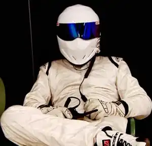 The show's "tame racing driver," who is never seen without his racing coveralls, gloves, and (face-concealing) helmet. Has a variety of local cousins in the various locations the Top Gear team visits. Some say that he sleeps inside out, and that he once had phone sex with Russell Brand's answering machine... all we know is, he's called The Stig.