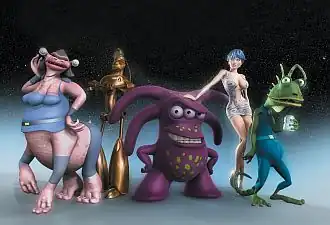 - Gag Boobs: Spamela Anderslut, a rather savage parody of Pamela Anderson, from the planet Titius Maximus. Her breasts are so big that she actually needs a specialized device just to carry them around. They even end up leading her downfall: just as she was about to win the "Miss Galaxy 5000" pageant, T'Nuk purposefully kicks her device out of the way, causing Spamela to fall and injure herself under the weight off her own breasts.