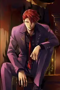 - Mythology Gag: His Palette Swap in Ougon Musoukyoku Cross gives him a black suit, white shirt, green tie, and white hair, mirroring the color scheme of Battler's appearance in the Episode 8 ???? as Toya Hachijo.