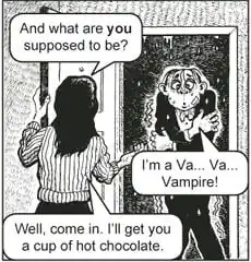 - Sam in Sluggy Freelance has this restriction, but not every vampire in the Sluggyverse does. On one occasion, Sam tracks down Dr. Schlock, who is decked out with every anti-vampire trick possible. He then points out Sam can't even enter his motel room without an invitation. In a rare moment of intelligence, Sam pulls out a gun, shoots Dr. Schlock in the leg, and asks, "Can I come in?"
