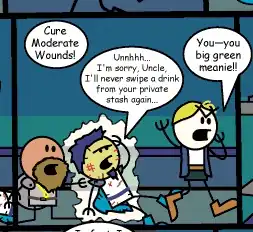 - The Order of the Stick: When Redcloak hits Hinjo with Disintegrate, it's enough to knock him out but not kill him. As shown in the page image, when he's healed, he wakes up mumbling, "I'm sorry, Uncle, I'll never take a drink from your private stash again..."