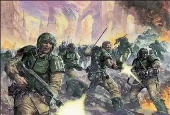 - ↑ Supposedly they are so regimented and disciplined that they will continue a column march with eyes forward even if they are being shot at. This seemingly era-mismatched style of warfare might be justified as their home planet is subject to frequent Chaos incursions, and the bright colors and iron discipline could very well be a method to keep the troops fighting and sane in the face of the mind-blasting horrors they are up against. Their planet is also constantly night time so the bright uniform may also be useful for identifying Friend From Foe in the darkness.