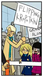 - A demonstration in Bad Machinery featured this with, as pictured above, rather polite signs reading "FLIPPING KROPOTKIN" and "COME ON NOW".