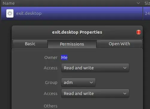chmod 775 /home/$USER/shutdown/shutdown.desktop (sets shutdown.desktop permission to -rwxrwxr-x)