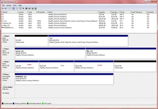 Disk 2: The new hard drive I installed Ubuntu on (or so I think). I added in red what each partition is.