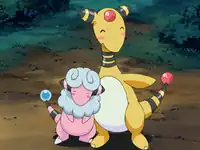 Brock offers to help, but Flaaffy’s Trainer, Mariah doesn’t respond. Instead Mariah runs to her Grandma Katie's drugstore for treatment, to which Ash and his friends follow after her. After a quick sip of medicine, Flaaffy heals in an instant. Ash and Brock immediately apologize and introduce themselves. Brock and Marshtomp quickly move on to holding Mariah and Flaaffy's hands and showing attraction. However, Max and May jump in and pull the lovesick twosome away. Suddenly McCauley and his Ampharos enter the store to show Katie his energy elixir. After a quick examination, she notes that McCauley didn't mix the Cheri Berry well, so she can't sell it. McCauley is disappointed by his efforts, admitting that he may never improve. Mariah tells him to focus on the positives and that he can always try again. Outside, Team Rocket spy on the drugstore and plot to steal and on-sell the medicines.