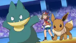 May suddenly has Eevee and Munchlax launch another attack but miss their target on purpose with both attacks colliding behind Wigglytuff and forcing it uncontrollably towards the ground. Marian notes that Wigglytuff may be capable of flight, but it is only the result of inflating its body by inhaling and exhaling air - May's attack has taken perfect advantage of this weakness. Munchlax runs forward and propels off Eevee's tail igniting into the air and striking Wigglytuff down with a Focus Punch, much to Harley's horror. Wigglytuff crashes into the ground and is announced as unable to battle. Harley's score is reduced to zero and May advances to the next round. May celebrates her victory, while Harley is shocked, his surprise quickly shifting to vicious spite.