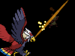 Braviary dives down at the opponent and flaps his wings once. Once he does, he moves so fast that he becomes a blur and he slams into the opponent. | ||